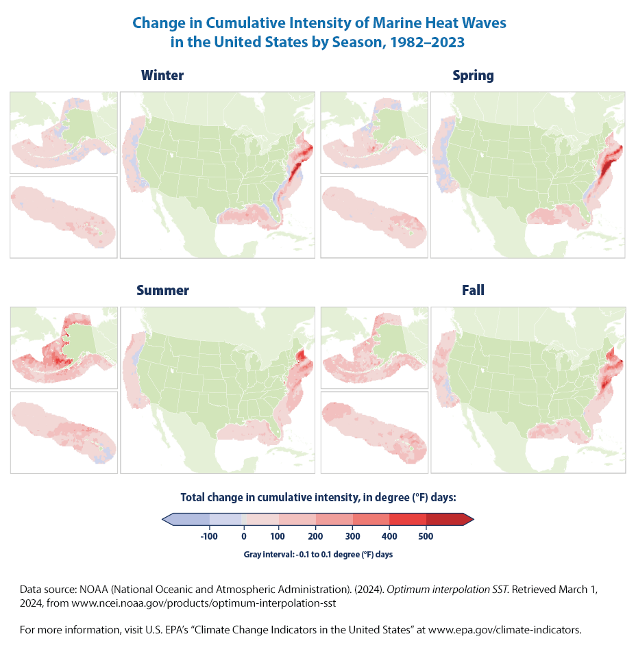Over the period shown (1982–2023), the annual cumulative intensity of marine heat waves has increased in most coastal U.S. waters, with the largest changes in waters off the northeastern U.S. and Alaskan coasts.